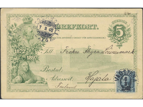 Sweden. Postal stationery, Single postcard, Facit bKe9, 56, 1897 Commemorative postcard 5 öre. This postal stationery wa.. Läs mer Sweden. Postal stationery, Single postcard, Facit bKe9, 56, 1897 Commemorative postcard 5 öre. This postal stationery was not approved for postcard rate abroad, hence additionally franked with 20 öre for letter rate, according to UPU regulations, as the value stamp was not acounted. EXCELLENT cancellation VADSTENA 6.3.1902, sent to Finland. Visa mindre