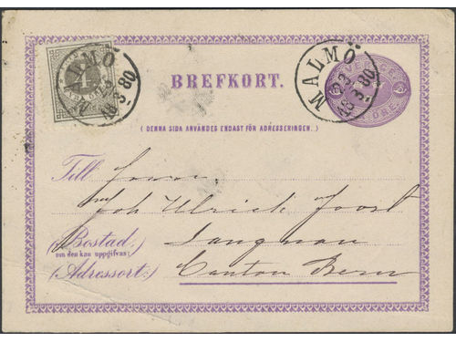 Sweden. Postal stationery, Single postcard, Facit bKe2CII, 29, Postcard 6 öre additionally franked with 6 öre, sent from.. Läs mer Sweden. Postal stationery, Single postcard, Facit bKe2CII, 29, Postcard 6 öre additionally franked with 6 öre, sent from MALMÖ 23.3.1880 to Switzerland. Weak creases. Visa mindre