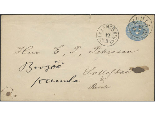 Sweden. Postal stationery, Stamped envelope, Facit Fk1I v1, Stamped envelope with the sought-after variety 'Re-engraved.. Läs mer Sweden. Postal stationery, Stamped envelope, Facit Fk1I v1, Stamped envelope with the sought-after variety 'Re-engraved value stamp', sent from KUMLA 12.5.1872 via PKXP 12.5.1872 to Sollefteå. Small tear at top, otherwise superb. Scarce. Facit 7000. Visa mindre