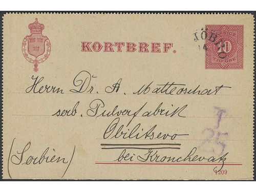 Sweden. Postal stationery, Letter card, Facit kB8, Letter card 10 öre sent insufficiently prepaid from DÖSJÖBRO 14.11.19.. Läs mer Sweden. Postal stationery, Letter card, Facit kB8, Letter card 10 öre sent insufficiently prepaid from DÖSJÖBRO 14.11.1910 to Serbia, with arrival pmk on reverse. Postage due mark T25. Very scarce destination. Visa mindre