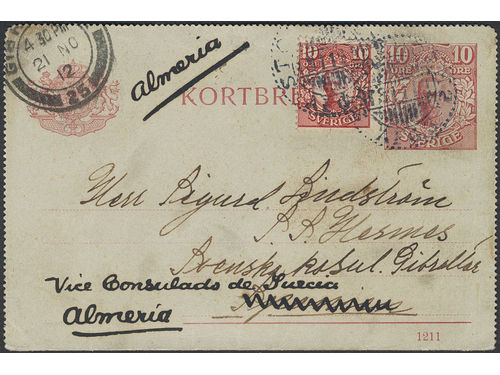 Sweden. Postal stationery, Letter card, Facit kB10, 82, Letter card 10 öre additionally franked with 10 öre, sent from S.. Läs mer Sweden. Postal stationery, Letter card, Facit kB10, 82, Letter card 10 öre additionally franked with 10 öre, sent from STOCKHOLM 13.11.12 to GIBRALTAR 19.NO.12, then forwarded to ALMERIA 22.NO.12. Visa mindre