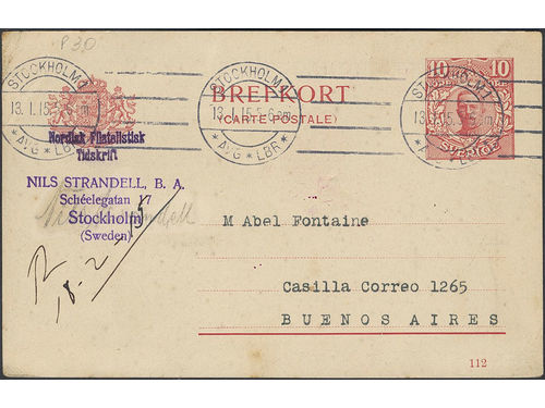 Sweden. Postal stationery, Single postcard, Facit bKe16/112, Postcard 10 öre sent by Nils Strandell from STOCKHOLM 1 13.1.15 to Argentina. Sweden. Postal stationery, Single postcard, Facit bKe16/112, Postcard 10 öre sent by Nils Strandell from STOCKHOLM 1 13.1.15 to Argentina. Visa mindre