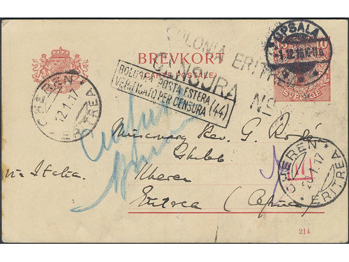 Sweden. Postal stationery, Single postcard, Facit bKe19/214, Postcard 10 öre sent from UPSALA 1.12.16 to missioner in Er.. Läs mer Sweden. Postal stationery, Single postcard, Facit bKe19/214, Postcard 10 öre sent from UPSALA 1.12.16 to missioner in Eritrea. Several censor marks plus arrival pmk CHEREN 12.1.17. Interesting item. Visa mindre