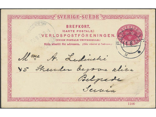 Sweden. Postal stationery, Single postcard, Facit bKe14/1106, Postcard 10 öre sent from PLK 341C 11.6.12 to Serbia, with arrival pmk. Superb. Sweden. Postal stationery, Single postcard, Facit bKe14/1106, Postcard 10 öre sent from PLK 341C 11.6.12 to Serbia, with arrival pmk. Superb. Visa mindre