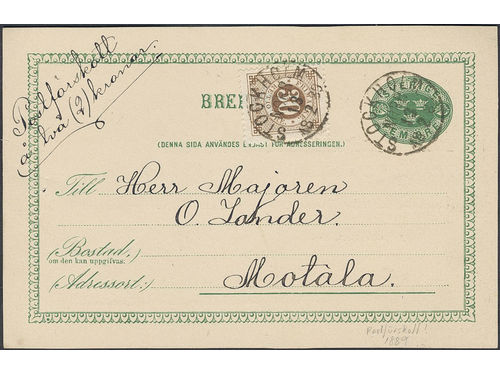 Sweden. Postal stationery, Single postcard, Facit bKe7, 47, Postcard 5 öre additionally franked with 30 öre, sent with c.. Läs mer Sweden. Postal stationery, Single postcard, Facit bKe7, 47, Postcard 5 öre additionally franked with 30 öre, sent with cash on delivery from STOCKHOLM NORR 13.2.1888 to Motala. C.O.D. postcards were prepaid as letters before 1/8 1892. Scarce. Visa mindre