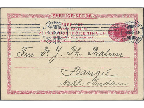 Sweden. Postal stationery, Single postcard, Facit bKe13, Postcard 10 öre sent from STOCKHOLM 5.8.08 to Bangal, Java, Net.. Läs mer Sweden. Postal stationery, Single postcard, Facit bKe13, Postcard 10 öre sent from STOCKHOLM 5.8.08 to Bangal, Java, Netherlands East India. Weak corner crease. Visa mindre