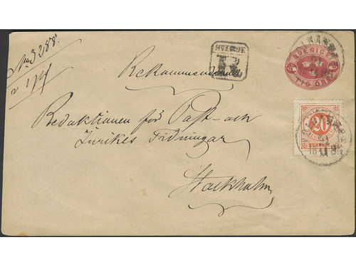Sweden. Postal stationery, Stamped envelope, Facit Fk3, 33, Stamped envelope 10 öre additionally franked with 20 öre, se.. Läs mer Sweden. Postal stationery, Stamped envelope, Facit Fk3, 33, Stamped envelope 10 öre additionally franked with 20 öre, sent registered from KOLHAMMAR 21.11.1885 to Stockholm. Visa mindre