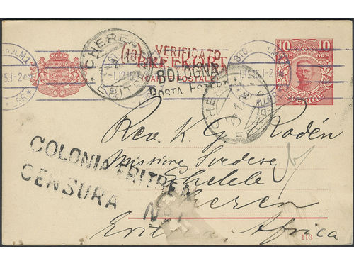 Sweden. Postal stationery, Single postcard, Facit bKe16/113, Postcard 10 öre sent from STOCKHOLM 1 1.12.15 to Eritrea, w.. Läs mer Sweden. Postal stationery, Single postcard, Facit bKe16/113, Postcard 10 öre sent from STOCKHOLM 1 1.12.15 to Eritrea, with censor and arrival marks. Visa mindre
