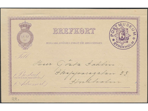 Sweden. Postal stationery, Postmusei vernissagepostkort, Facit PMvpK1, Postcard '6 öre' sent under cover from POSTMUSEUM.. Läs mer Sweden. Postal stationery, Postmusei vernissagepostkort, Facit PMvpK1, Postcard '6 öre' sent under cover from POSTMUSEUM STOCKHOLM 3.5.1919 to Gösta Sahlin, Stockholm. Circulation, only 123 copies. SEK 4000 Visa mindre