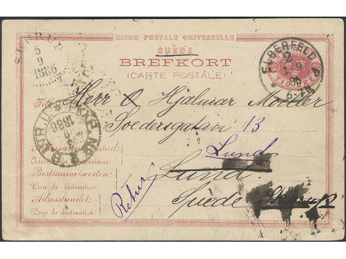 Sweden. Postal stationery, Single postcard, Facit bKe4, Single postcard 10 öre used, against regulations, as a response.. Läs mer Sweden. Postal stationery, Single postcard, Facit bKe4, Single postcard 10 öre used, against regulations, as a response card from ELBERFELD 1.9.85 to LUND 3.9.1886, then forwarded to SKURUP 5.9.1886 and finally back to LUND6.9.1885. Visa mindre