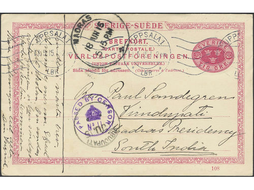 Sweden. Postal stationery, Single postcard, Facit bKe14/108, Postcard 10 öre sent from UPPSALA 1 11.5.15 to South India... Läs mer Sweden. Postal stationery, Single postcard, Facit bKe14/108, Postcard 10 öre sent from UPPSALA 1 11.5.15 to South India. Censor mark PASSED BY CENSOR No 11 and arrival pmk MADRAS 18.JUN.15. Visa mindre
