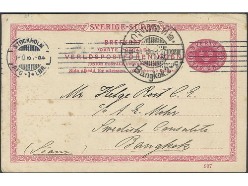 Sweden. Postal stationery, Single postcard, Facit bKe14/907, Postcard 10 öre sent from STOCKHOLM 1.10.08 to Siam, with a.. Läs mer Sweden. Postal stationery, Single postcard, Facit bKe14/907, Postcard 10 öre sent from STOCKHOLM 1.10.08 to Siam, with arrival pmk Bangkok 2 27.10.08. Visa mindre
