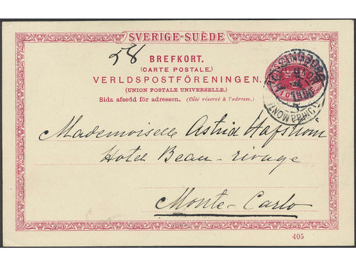 Sweden. Postal stationery, Single postcard, Facit bKe14/405, Postcard 10 öre sent from HELSINGBORG 9.4.1906 to Monaco, with arrival pmk MONTE CARLO. Sweden. Postal stationery, Single postcard, Facit bKe14/405, Postcard 10 öre sent from HELSINGBORG 9.4.1906 to Monaco, with arrival pmk MONTE CARLO. Visa mindre