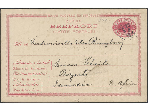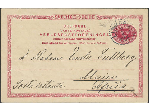Sweden. Postal stationery, Single postcard, Facit bKe13, Postcard 10 öre sent from LINKÖPING 2.4.1905 to Algeria, with weak arrival pmk ALGER. Sweden. Postal stationery, Single postcard, Facit bKe13, Postcard 10 öre sent from LINKÖPING 2.4.1905 to Algeria, with weak arrival pmk ALGER. Visa mindre
