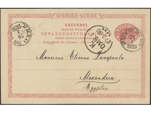 Sweden. Postal stationery, Single postcard, Facit bKe13, Postcard 10 öre sent from PKXP No 30 26.3.1890 via K. OMB.2 27... Läs mer Sweden. Postal stationery, Single postcard, Facit bKe13, Postcard 10 öre sent from PKXP No 30 26.3.1890 via K. OMB.2 27.3.90 to Egypt, with arrival pmk on the reverse. Visa mindre