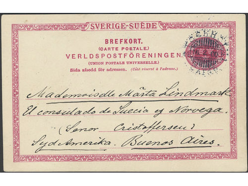 Sweden. Postal stationery, Single postcard, Facit bKe13, Postcard 10 öre sent from STOCKHOLM 16.2.00 to Argentina. Sweden. Postal stationery, Single postcard, Facit bKe13, Postcard 10 öre sent from STOCKHOLM 16.2.00 to Argentina. Visa mindre