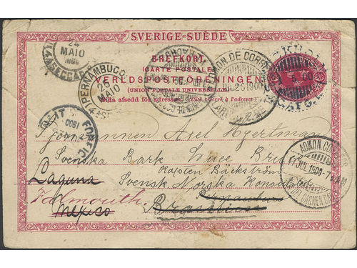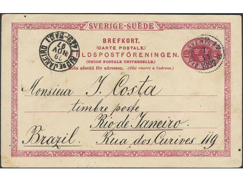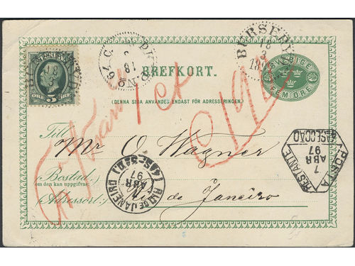 Sweden. Postal stationery, Single postcard, Facit bKe7, 52, Postcard 5 öre additionally franked with 5 öre, sent from BU.. Läs mer Sweden. Postal stationery, Single postcard, Facit bKe7, 52, Postcard 5 öre additionally franked with 5 öre, sent from BURSERYD 18.3.1897 via PKXP No 64 C 18.3.1897 to Brazil. Arrival pmks RIO DE JANEIRO 7.ABR.97 and POSTA RESTANTE 4ASLOCAO 8.ABR.97. Ex. Daun. Visa mindre