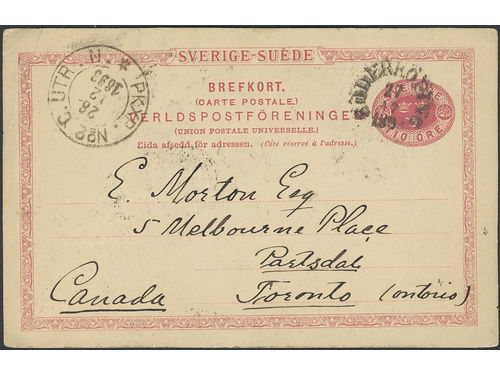 Sweden. Postal stationery, Single postcard, Facit bKe7, 52, Postcard 5 öre additionally prepaid with 5 öre, sent from HE.. Läs mer Sweden. Postal stationery, Single postcard, Facit bKe7, 52, Postcard 5 öre additionally prepaid with 5 öre, sent from HELSINGBORG 19.4.1896 to Saint John, New Brunswick. The card with small creases. Visa mindre