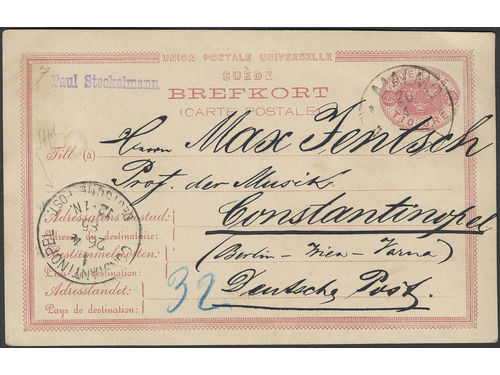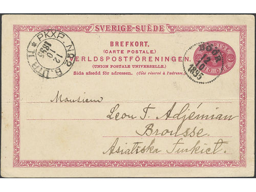 Sweden. Postal stationery, Single postcard, Facit bKe13, Postcard 10 öre sent from HÖÖR 12.10.1895 via PKXP No 2 B UTR N.. Läs mer Sweden. Postal stationery, Single postcard, Facit bKe13, Postcard 10 öre sent from HÖÖR 12.10.1895 via PKXP No 2 B UTR N 12.10.1895 to Asian part of Turkey, with pmk CONSTANTINOPLE-GALATA 16.OCTOBRE.1895. Weak crease. Visa mindre