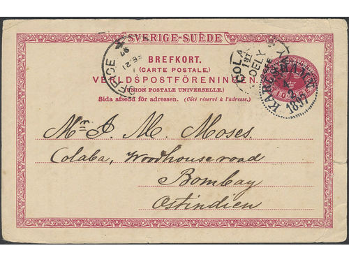 Sweden. Postal stationery, Single postcard, Facit bKe13, Postcard 10 öre sent from KARLSHAMN 4.2.1897 via SEA POST OFFIC.. Läs mer Sweden. Postal stationery, Single postcard, Facit bKe13, Postcard 10 öre sent from KARLSHAMN 4.2.1897 via SEA POST OFFICE 12.FE.97 to India, with arrival pmk COLABA 1ST DELY 26.FE.97. Small creases/tears. Visa mindre