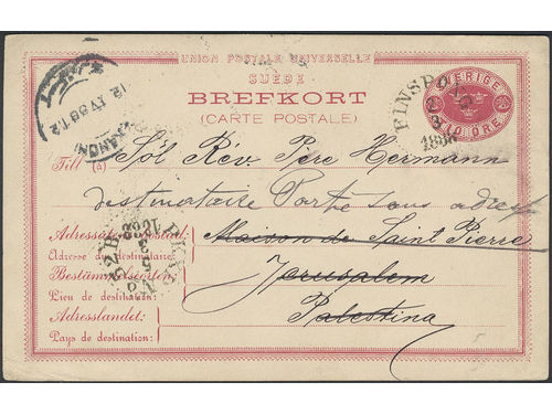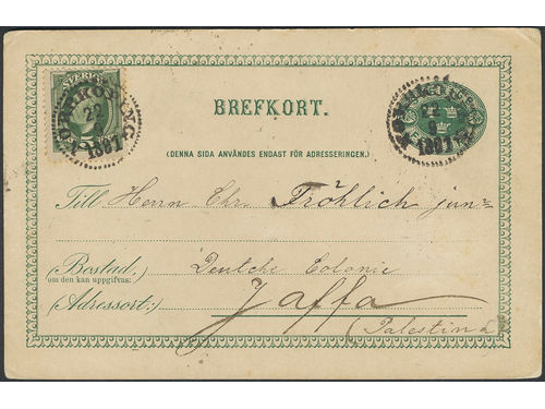 Sweden. Postal stationery, Single postcard, Facit bKe7, 52, Postcard 5 öre additionally franked with 5 öre, sent from NO.. Läs mer Sweden. Postal stationery, Single postcard, Facit bKe7, 52, Postcard 5 öre additionally franked with 5 öre, sent from NORRKÖPING 22.9.1891 via PKXP No 2 A UTR N 23.9.1891 to Palestine, with arrival pmk JAFFA on the reverse. Visa mindre