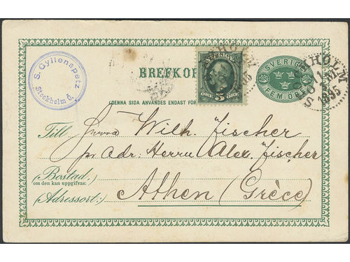 Sweden. Postal stationery, Single postcard, Facit bKe7, 52, Postcard 5 öre additionally franked with 5 öre, sent from ST.. Läs mer Sweden. Postal stationery, Single postcard, Facit bKe7, 52, Postcard 5 öre additionally franked with 5 öre, sent from STOCKHOLM Ö M 11.3.1895 to Greece, with arrival pmk on the reverse. Visa mindre