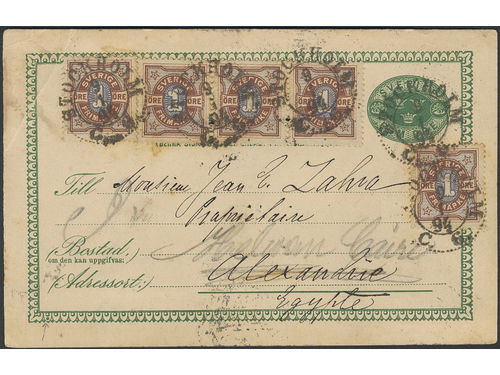 Sweden. Postal stationery, Single postcard, Facit bKe7, 61, Postcard 5 öre additionally franked with 5×1 öre, sent from.. Läs mer Sweden. Postal stationery, Single postcard, Facit bKe7, 61, Postcard 5 öre additionally franked with 5×1 öre, sent from STOCKHOLM 9.1.94 to Egypt. Forwarded from Alexandria to HÉLOUAN 18.1.94. Visa mindre