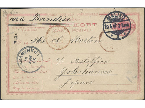 Sweden. Postal stationery, Single postcard, Facit bKe4, Postcard 10 öre sent from MALMÖ 20.4.97 'via Brindisi' to Japan,.. Läs mer Sweden. Postal stationery, Single postcard, Facit bKe4, Postcard 10 öre sent from MALMÖ 20.4.97 'via Brindisi' to Japan, with arrival pmk YOKOHAMA JAPAN 29.MAY.97. Visa mindre