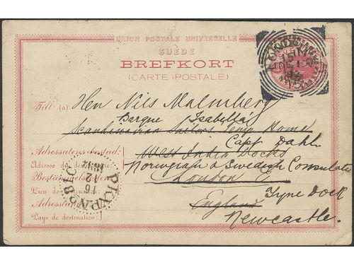 Sweden. Postal stationery, Single postcard, Facit bKe4, Postcard 10 öre sent from NYKÖPING 15.12.1892 via PKXP No 81C 16.. Läs mer Sweden. Postal stationery, Single postcard, Facit bKe4, Postcard 10 öre sent from NYKÖPING 15.12.1892 via PKXP No 81C 16.12.1892 to Great Britain, then forwarded from LONDON 19.DE.92 to Newcastle. Visa mindre