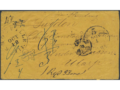 Sweden. Foreign-related cover. USA. Unpaid cover sent from KNOXVILLE 12.OCT via HAMBURG 20.11, STRALSUND 22.11 and YSTAD.. Läs mer Sweden. Foreign-related cover. USA. Unpaid cover sent from KNOXVILLE 12.OCT via HAMBURG 20.11, STRALSUND 22.11 and YSTAD 23.11.1860. Notation '1 Rd 33 öre' and '164'. Visa mindre
