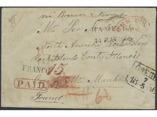 Sweden. Foreign-related cover. USA. Prepaid cover sent from ÖREBRO 7.5.1856 via HAMBURG 14.MAY.1856, ST.P.A. BREMEN 15.5.. Läs mer Sweden. Foreign-related cover. USA. Prepaid cover sent from ÖREBRO 7.5.1856 via HAMBURG 14.MAY.1856, ST.P.A. BREMEN 15.5 and NEW YORK to Rock Island, Illinois. Visa mindre