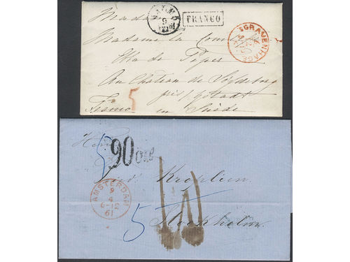 Sweden. Foreign-related cover. Netherlands. One prepaid cover sent from SGRAVENHAGE 6.12.1861 to Ystad and one unpaid le.. Läs mer Sweden. Foreign-related cover. Netherlands. One prepaid cover sent from SGRAVENHAGE 6.12.1861 to Ystad and one unpaid letter sent from AMSTERDAM 6.12.61 to Stockholm with postage due mark 90 öre. (2). Visa mindre