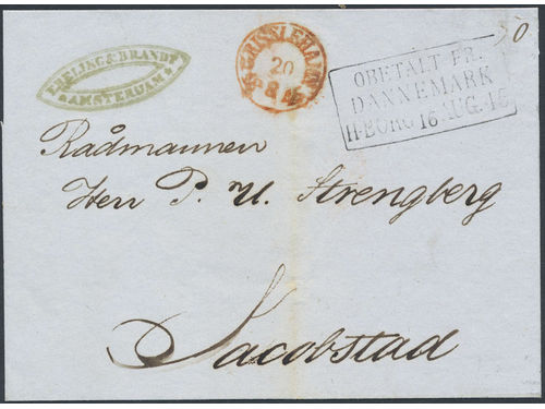 Sweden. Foreign-related cover. Netherlands. Cover sent from Amsterdam with notation on the reverse 'Helsingiör d 16 augu.. Läs mer Sweden. Foreign-related cover. Netherlands. Cover sent from Amsterdam with notation on the reverse 'Helsingiör d 16 august 1845 pr Lovisa ...', in transit via Helsingborg with pmk OBETALT FR. DANNEMARK H.BORG 16.AUG.45 and GRISSLEHAMN 20.8.45 to Finland. Weak vertical fold. Interesting item. Visa mindre