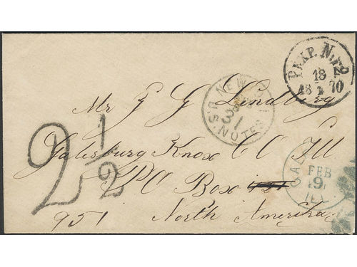 Sweden. Foreign-related cover. USA. Unpaid cover sent from PKXP N:r 2 18.1.1870 to Galesburg Knox, Ill, with transit mar.. Läs mer Sweden. Foreign-related cover. USA. Unpaid cover sent from PKXP N:r 2 18.1.1870 to Galesburg Knox, Ill, with transit mark KIEL HAMBURG 19.1 and accountancy marks 2½ a.P. and 2½. Visa mindre