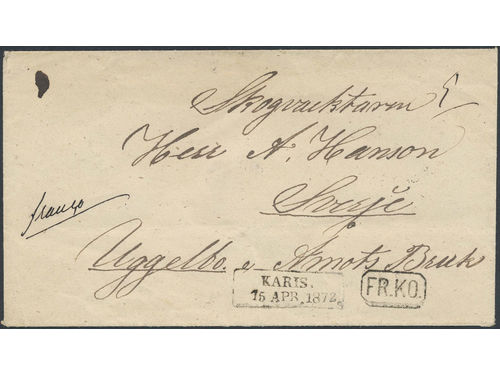 Sweden. Foreign-related cover. Finland. Prepaid cover sent from KARIS 15.APR.1872 via STOCKHOLM N:r 7 24.4.1872 (P: 2000) to Uggelbo. Sweden. Foreign-related cover. Finland. Prepaid cover sent from KARIS 15.APR.1872 via STOCKHOLM N:r 7 24.4.1872 (P: 2000) to Uggelbo. Visa mindre