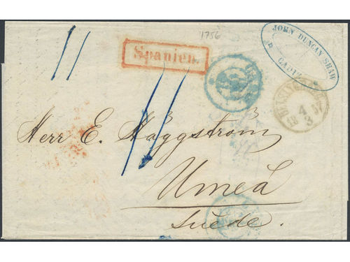 Sweden. Foreign-related cover. Spain. Cover sent from CADIZ via K.S.P.A. HAMBURG 1.3.1857 and HELSINBORG 4.3.1857 to Umeå. Sweden. Foreign-related cover. Spain. Cover sent from CADIZ via K.S.P.A. HAMBURG 1.3.1857 and HELSINBORG 4.3.1857 to Umeå. Visa mindre