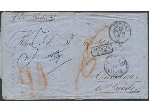 Sweden. Foreign-related cover. Switzerland. Unpaid letter (worn) sent from VERNER 12.OCT.61 via HAMBURG TH&T 15.10.1.. Läs mer Sweden. Foreign-related cover. Switzerland. Unpaid letter (worn) sent from VERNER 12.OCT.61 via HAMBURG TH&T 15.10.1861 and YSTAD 18.10.1861 to Kalmar. Visa mindre