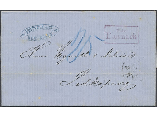 Sweden. Foreign-related cover. Denmark. Incoming letter dated 'Köpenhamn d 12 Juli 1866' sent via MALMÖ 13.7.1866 to Lid.. Läs mer Sweden. Foreign-related cover. Denmark. Incoming letter dated 'Köpenhamn d 12 Juli 1866' sent via MALMÖ 13.7.1866 to Lidköping. With the mark 'Från Danmark' in violet colour. Postage due notation '25'. Postal: 3000:- Visa mindre