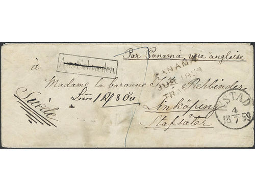 Sweden. Foreign-related cover. Pamama. Unpaid cover sent from unknown place along the American west coast via PANAMA TRA.. Läs mer Sweden. Foreign-related cover. Pamama. Unpaid cover sent from unknown place along the American west coast via PANAMA TRANSIT 8.JU.1859 conveyed by RMSPCo 'Trent' and 'Atrato' via St Thomas to Europe, and then sent via HAMBURG 1.7 and YSTAD 4.7.1859 to Linköping. Ex. Bertil and Kersti Larsson. Visa mindre