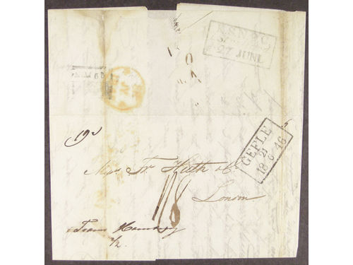 Sweden. Foreign-related cover. Great Britian. Letter sent from GEFLE 21.6.1846 to London. Notation 'Franco Hamburg'. Tra.. Läs mer Sweden. Foreign-related cover. Great Britian. Letter sent from GEFLE 21.6.1846 to London. Notation 'Franco Hamburg'. Transit pmk KSPNC I STRALSUND D. 27 JUNI (P: 1500) and with arrival pmk. Visa mindre