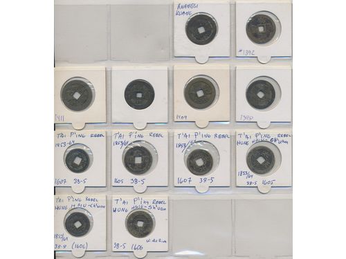 Coins, China, Ancient. Collection of one cash denomination of Qing Dynasty's various rulers. Written up in English on ea.. Läs mer Coins, China, Ancient. Collection of one cash denomination of Qing Dynasty's various rulers. Written up in English on each page, usually identified by Schjöth numbers. Includes several palace cash coins and a wide range of 1 cash including Taiping rebellion issues. In total 205 coins. From collection of Scandinavian Origin. Please inspect carefully! F-XF. Visa mindre