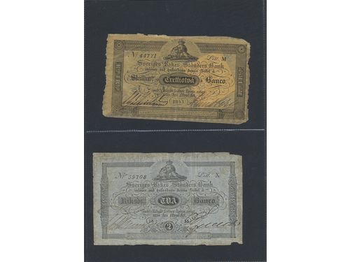 Private banknotes, Sweden. Pick S521g, 2 riksdaler banco 1845. No 32571. Fresh example of this large note, minor corner loss of upper left corner and small ink writing on reverse. Interesting documentation from 1923 accompanying the note whereby it was sent to Holmbergs Mynthandel for appraisal, and later returned to its owner. 1/1+. Visa mindre