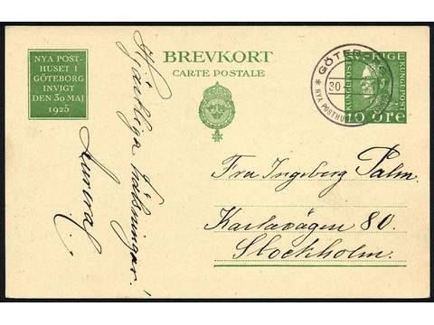 Sweden. Postal stationery, Single postcard, Facit bKe24d, Postcard 10 öre cancelled GÖTEBORG NYA POSTHUSETS INVIGNING 30- -25, sent to Stockholm.