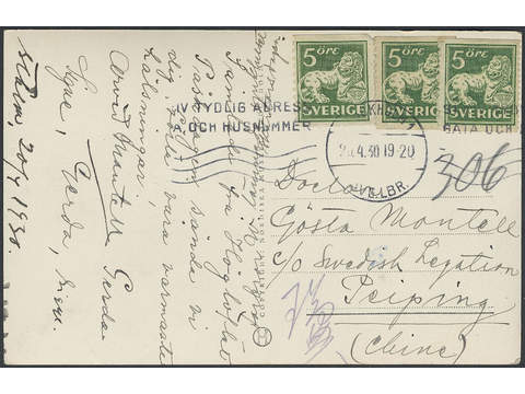 China Incoming mail. Michel 143E, 143A cover , Sweden. 3x5 öre, in two different perforations, on postcard sent from STOCKHOLM 1 26.4.30 to Bejing, China.