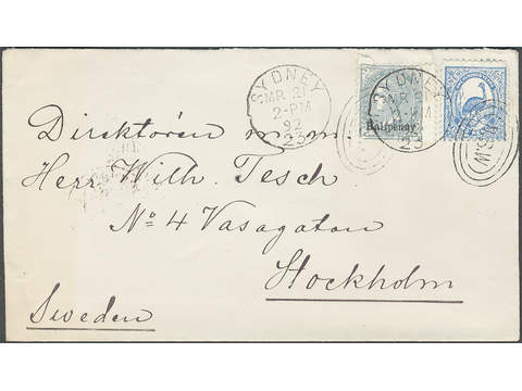 Australia New South Wales. Michel 64, 75 cover , Cover of lowest rate SYDNEY MR 21 92 sent to Sweden. Franked with 2 pence blue and 1/2 penny overprint (defective).