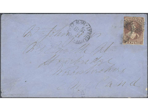 New Zealand. Michel 29 cover , 1864 Queen Victoria 6 d red-brown wmk NZ, perf 12½ as …