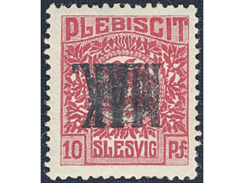 Denmark Schleswig. Facit 4 or Scott 4 ★★ , 1920 Lion and Landscape 10 pf red perforated, with black MAK overprint. Mi 4P3. One short perf. Scarce never hinged.