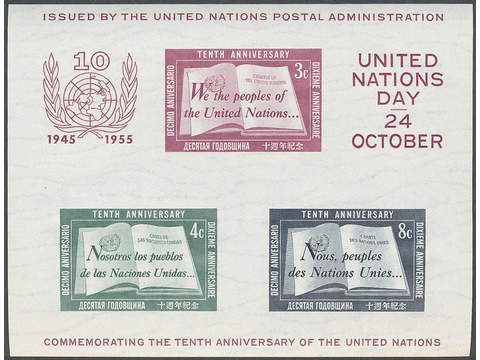 U.N., New York. Michel 42–44 ★★, 1955 United Nations Day souvenir sheet 1. Four copies.