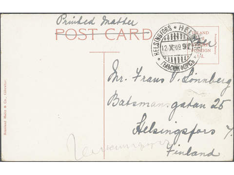 Gibraltar. Michel 56 cover , 1907 King Edward VII ½ d blue-green wmk multiple CA on postcard as single franking for printed matter sent to Finland. Scarce destination. Cancelled GIBRALTAR 4 OC 09. Arrival cds HELSINGFORS 12.X.09.