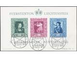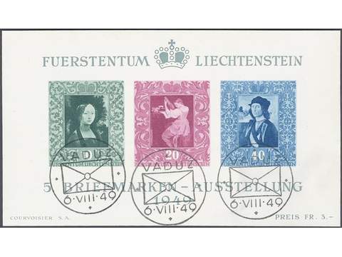 Liechtenstein. Michel 278–80 used, 1949 Vaduz Stamp Exhibition souvenir sheet 5. EUR 170